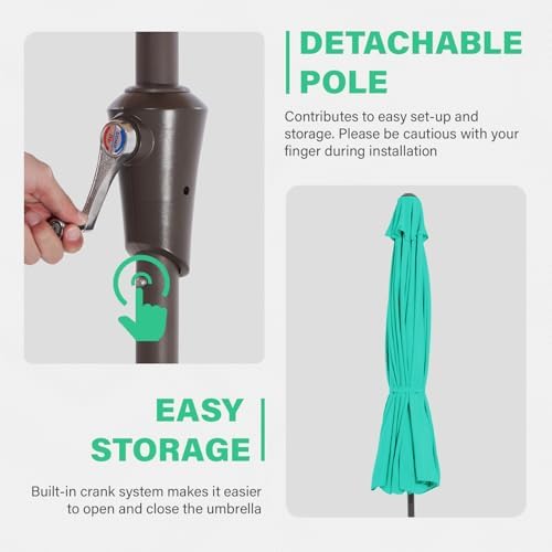 The 1.5-inch detachable pole ensures hassle-free set-up and storage. Please handle with care during installation to avoid pinching fingers. (Note: Umbrella base is not included.)
